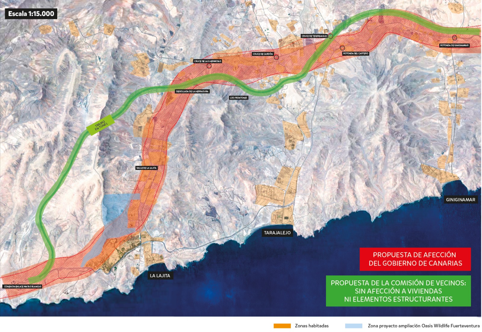 In recent weeks, opposition to the proposed route has intensified, particularly after mobilizations organized by residents, business owners, and farmers from La Lajita. These groups have raised alarms about the project’s potential to disrupt around 80 hectares of agricultural land, housing, and even the Oasis Wildlife Fuerteventura park. They proposed an alternative route that would divert the highway through the Valle de Guerepe, aiming to minimize the disruption to local economic activities.